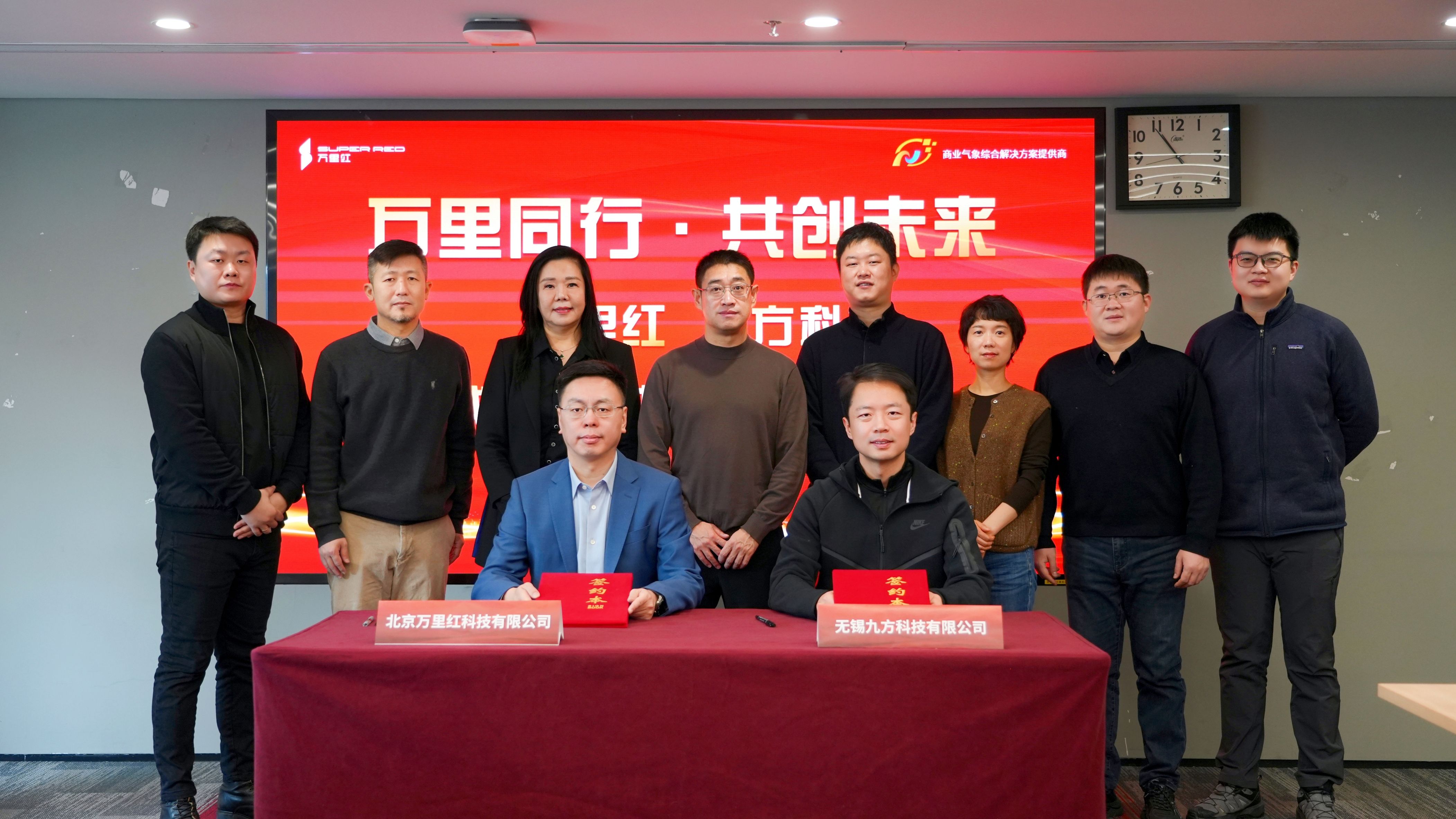 2026年2月3日上午,无锡九方科技有限公司与北京万里红科技有限公司战略合作签约仪式在北京未来科技大厦圆满举行。九方科技董事长、总经理周峥率副总经理梁逸爽、党支部书记韩秋芳、总工程师王明清、气象海洋事业部副总裁王雄一行出席签约现场。万里红科技董事长郑鹏、党支部书记兼总裁张小亮、第二行业事业部总经理刘宇、副总经理韩智、战略与市场营销负责人翟晓帆等公司管理层共同见证。
